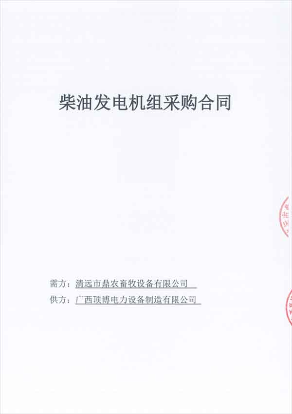 2020年12月31日,在這2020年的最后一天,廣西頂博電力設備制造有限公司再度傳來好消息,頂博電力與清遠市鼎農畜牧設備有限公司成功簽訂兩臺柴油發電機組,分別是50KW玉柴柴油發電機組一臺和100KW玉柴柴油發電機組一臺。
