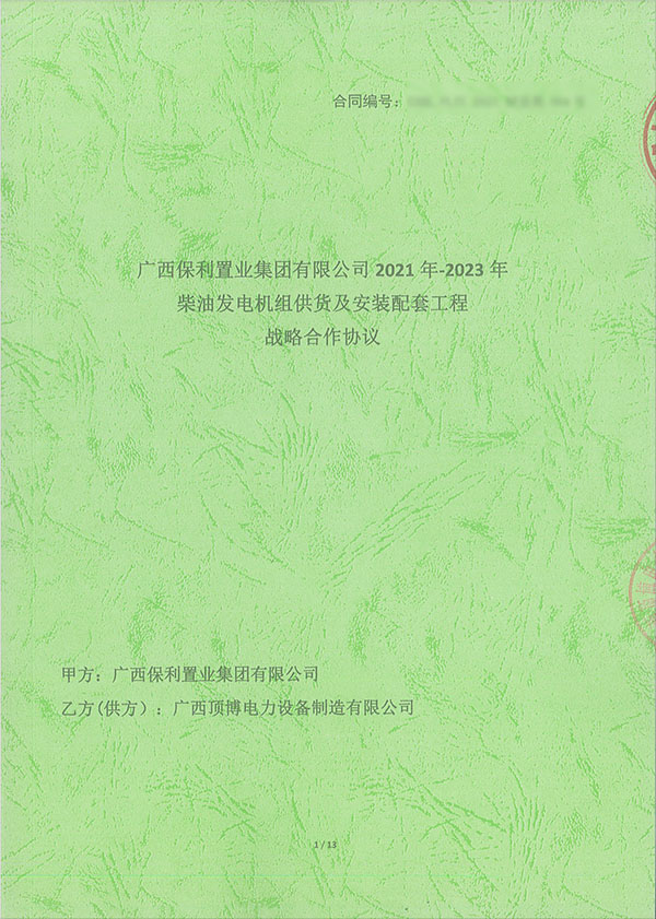 2021年7月26日,廣西頂博電力設備制造有限公司傳來喜訊,我公司成功與保利置業集團成功簽訂2021年-2023年柴油發電機組供貨及安裝配套工程戰略合作協議,標志著接下來的兩年時間內,作為戰略合作單位的保利集團或其控股的各房地產公司或項目公司在建和即將開發項目的