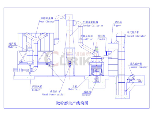 碳酸鈣超細磨粉機的設備組成全套配置包括錘式破碎機、斗式提升機、儲料倉、震動給料機、微粉磨主機、變頻分級機、雙聯旋風集粉器、脈沖除塵系統、高壓風機、空氣壓縮機、電器控制系統。